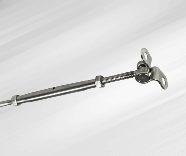 Turnbuckles are fittings with two opposing threaded bolts facing each other, such that when the fitting is turned, the bolts are pushed further apart or pulled together. These allow for tensioning and adjustment after installation.